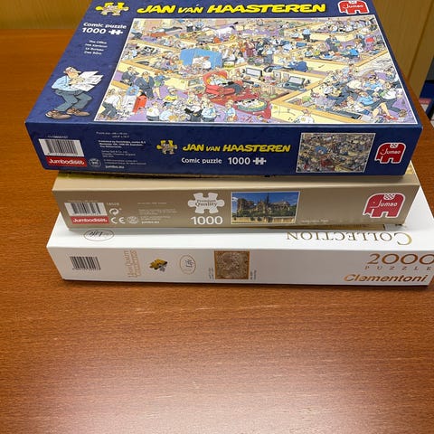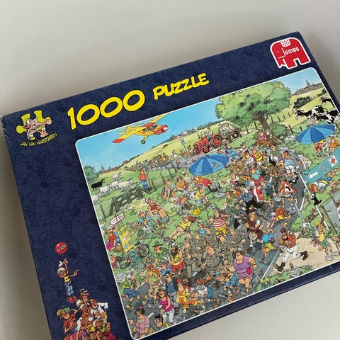 Jan van Haasteren Comic Puzzle palapeli, jossa on 1000 palasta. Palapelin kuva-aiheena on sarjakuva, joka sisältää yksityiskohtaisia ja humoristisia elementtejä.