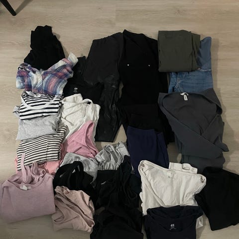 Anna Field -merkin musta äitiys-/imetyspaita, harmaa mekko ja kaksiosainen asu, jossa kynähame ja lyhyt yläosa. Vaatteet lähes käyttämättömiä. Vaatteet yhteensä 20 euroa.