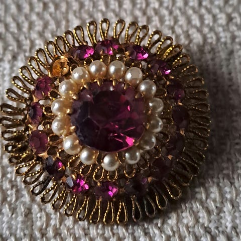 Punaisia ja kirkkaita helmiä ja keskellä korua musta puinen osa. Noin 4 cm halkaisijaltaan. Takana toimiva kiinnitysmekanismi. Savuton ja kotielimetön talous.