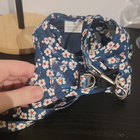 Kissan/ pienen koiran valjaat ja flexi merkkinen talutushihna, jossa kelamekanismi, joka mahdollistaa hihnan pituuden säätämisen.