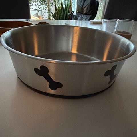 Ruostumattomasta teräksestä valmistettu koiran ruokakuppi, halkaisija noin 16cm ja korkeus noin 9cm. Soveltuu pitkäkorvaiselle koiralle, koska kupin muoto on kaareva, mikä estää korvien menoa kuppiin.