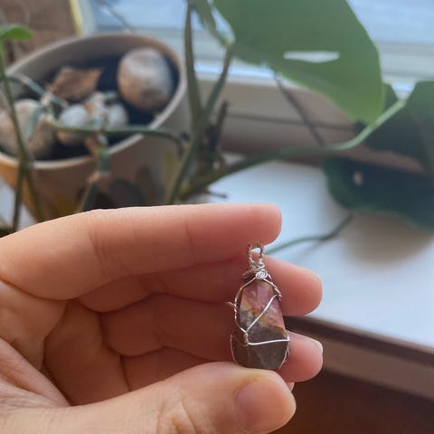 En tiedä mikä kivi on, mutta on aito! Luulen että ametysti, lilan värin perusteella.
