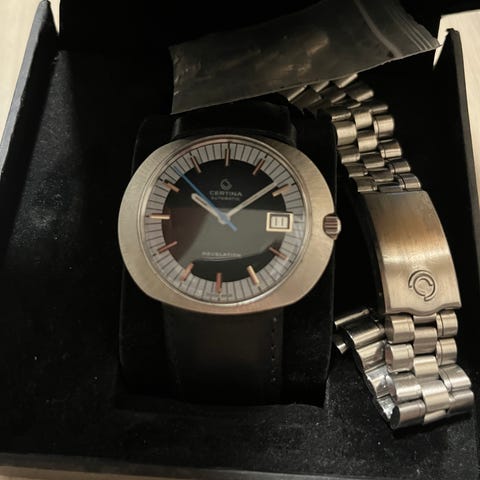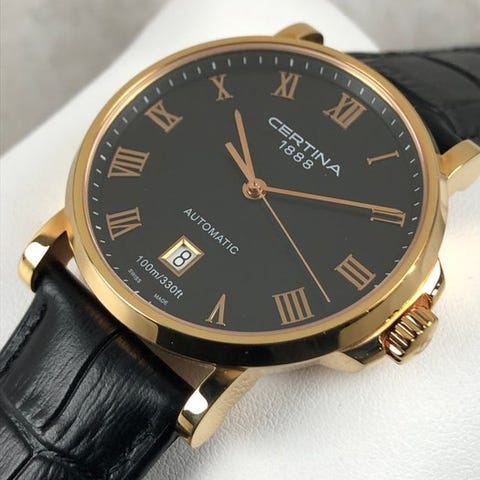 Certina - DS Caimano Automatic - C017.407.36.053.00Kast: Edelstaal rosé kultaa kullattuKello: Sveitsissä valmistettu ETA-automaattiWijzerplaat: mustaHalkaisija: 38 mm (ilman kruunua)Lasi: SafiirilasiMerkneutraal musta nahkainen ranneke alkuperäisellä sulkimella.Ranteen koko: 21 cmKunto: Uusi!Takuu: 1 vuosi 'de Horlogemeesters'Toimitus: saapuu alkuperäisessä laatikossa.Lähetys: tämä kello lähetetään rekisteröitynä (DHL-express).