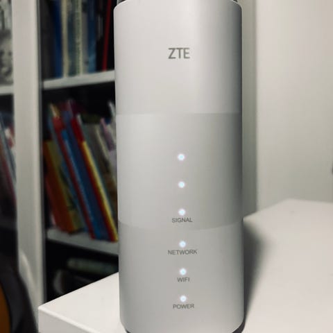 Huawei 5G-reititin valkoisella värillä. Laite tukee 5G-yhteyksiä ja on tarkoitettu langattomaan verkon jakamiseen. Kompakti muotoilu soveltuu kotikäyttöön tai pieniin toimistoihin.