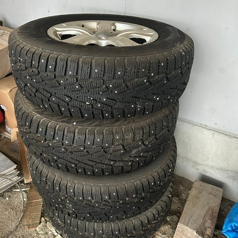 Pinnattut nastarenkaat. Pintaa reilusti. Ikää on. Lähinnä johonkin pihahärveliin tai off-road käyttöön. Vanteet muistaakseni patrollista.