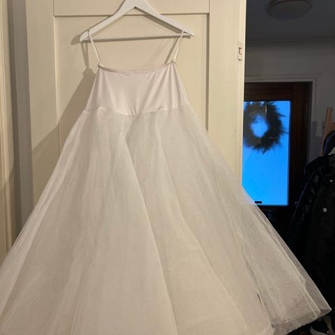 Myydään häiden jälkeen ja muuton takia Poirier-merkkinen vannehame, koko M. Ostettu käytettynä, yhteensä kahdella ollut käytössä. Siistissä kunnossa, ei ole pesty käytön jälkeen (ei likaa näkyvissä). Alimmainen kangas on tyllimäistä, lisäksi hameessa on tyllikerros ja satiinimainen kangas. Hameessa on kaksi vannekehää.