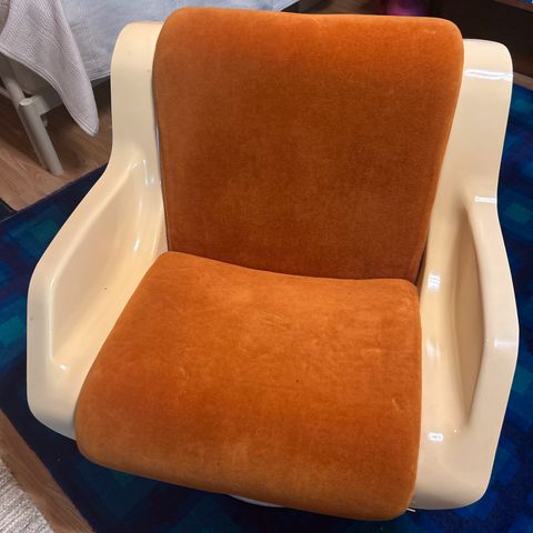 Suunnittelija Yrjö Kukkapuro 1969. Alkuperäinen ja kunto ikäisekseen hyvä. Vaatii kunnostusta ja vähintään verhoilun. Puuttuu teräslenkki ja yksi nahkaremmi.