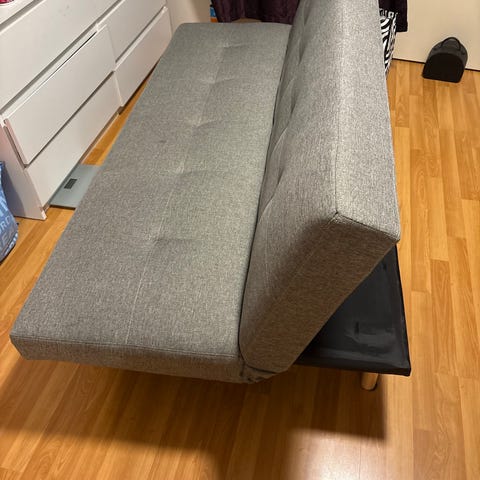 Kotimainen vuodesohva vuodevaatelaatikolla. Sohvassa divaani. Helposti muutettavissa sängyksi. Tyynyjen kangas vetoketjuilla, eli helposti pestäviä.