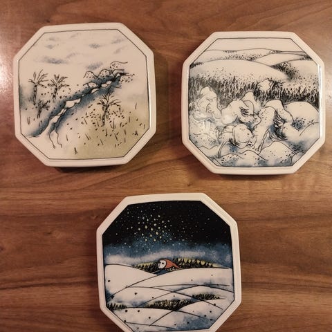 Myyn kaksi Heljä-Liukko Sundströmin seinälautasta - Kellohelmat ja Talvi tulee. Hinta 30€/kpl., 50€ molemmat yhteensä.