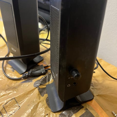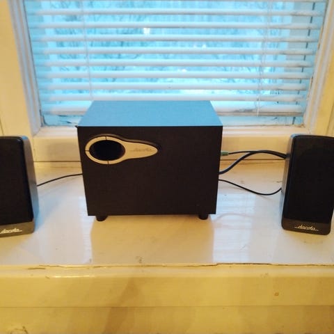 Tässä hyvät kaiuttimet vahvistimella ja äänen säädöllä, oma virtajohto verkkovirralle.