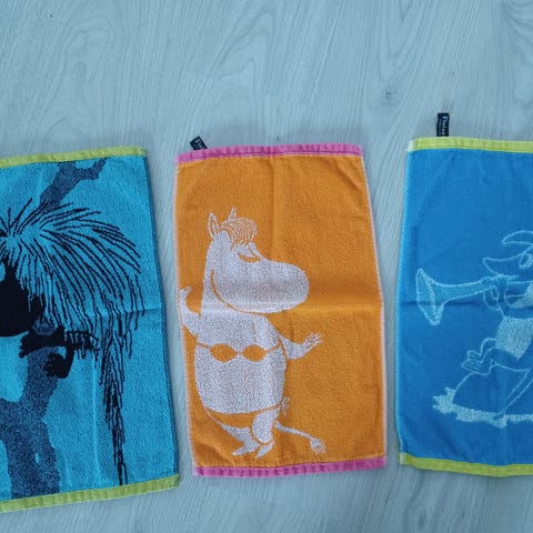 Lähinnä kaapissa olleita Muumi-pyyhkeitä 2 kpl, toinen kooltaan n. 70 x 50 cm, pienempi 50 x 30 cm. Finlaysonin valmistamia.