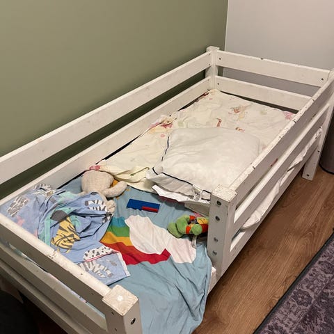 Veke jatkettava Juniorisänky turvalaidalla. Kuultolakattua puuta, jossa jonkun verran käytön jälkeä. Mukaan saa ohuen patjan ja sen jatkopalan. Vain nouto, autamme kantamaan ulos.