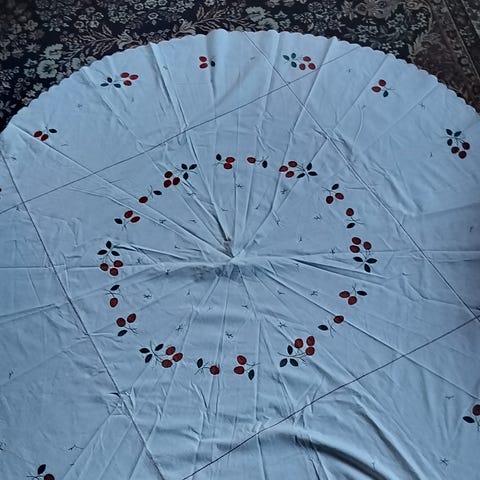 Puuvilla langasta itse virkattu pyöreä pöytäliina, halkaisija 80cm. Hyväkuntoinen.