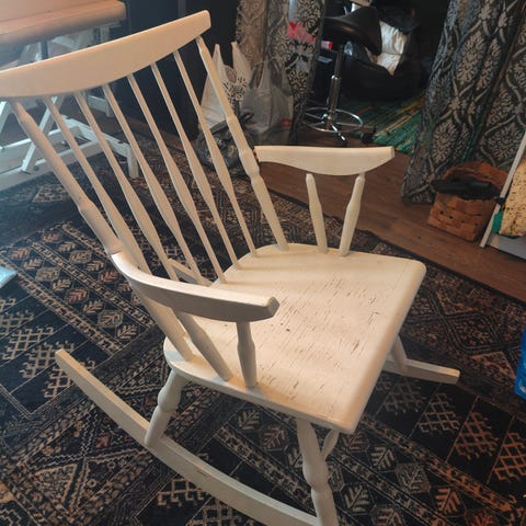 Lasten keinutuoli hyvässä kunnossa, mutta maalipinta haalistunut.