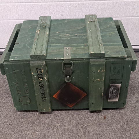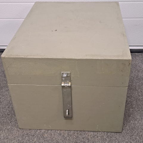 Vanerinen varastolaatikko, jossa on saranoitu kansi ja metalliset salvat. Laatikossa on maalipinta ja maalattu merkintä EPTRI. Sisäpuoli on käsittelemätön vaneripinta. Päädyissä kantokahvat. Koko: leveys 80 cm x syvyys 50 cm x korkeus 60 cm. Kannessa salvat, päädyissä kantokahvat. Nouto Kurikasta tai sovitaan erikseen.