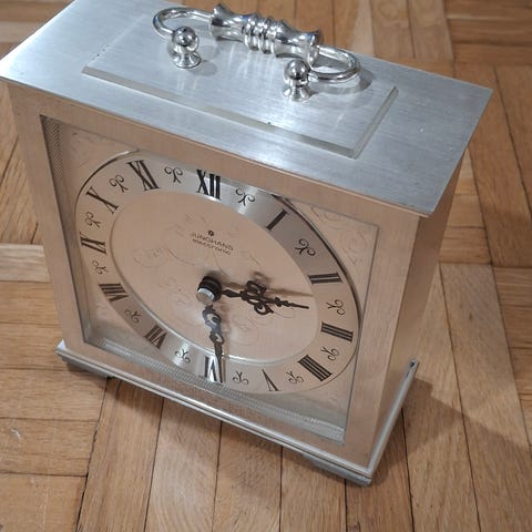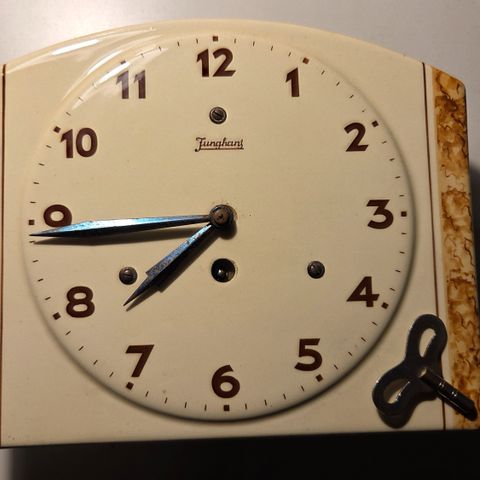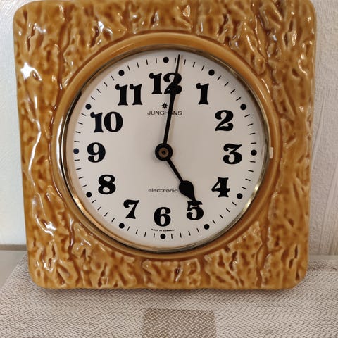 Kello kaikin puolin upeassa kunnossa. Käy tarkkaa aikaa patterilla. Korkeus 20.5cm ja leveys 22cm. Kello vuodelta -67.