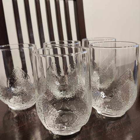 Vanha juomasetti missä 5 mukia ja 2 kannua.