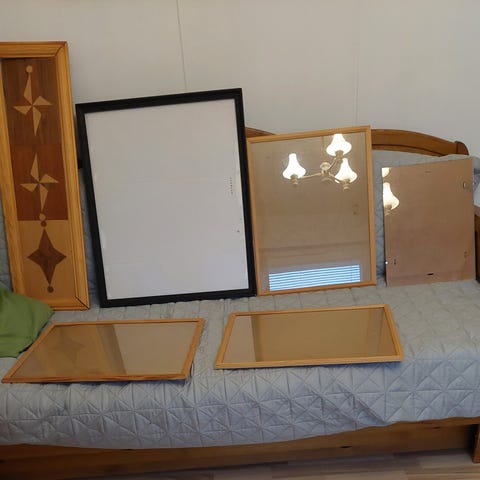 Vaaleanpunainen monikuvakehys, jossa useita eri kokoisia ja muotoisia kehyksiä.