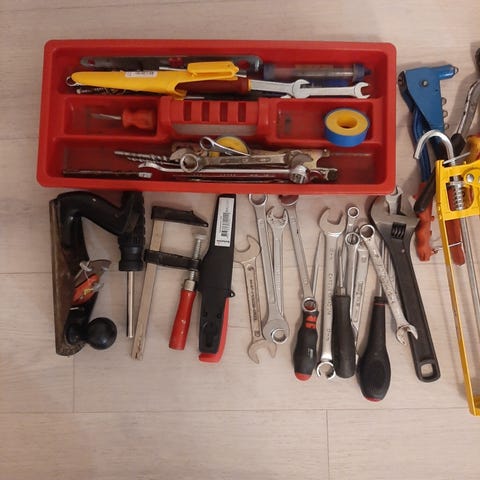 Laatoitus tarvikkeita sekä puinen kanto salkku tai jokin..