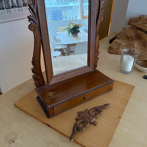 Myydään kuvan mukainen antiikki peili. Kokonaispituus 140 cm leveys alhaalta 50 cm leveimmästä kohdasta 53 cm. Yläosasta haljennut (katso kuva), tämä liimattu.