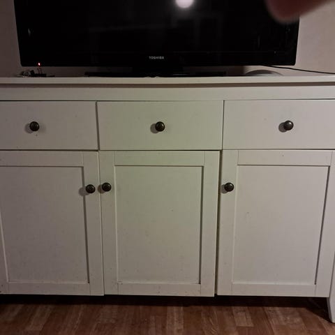 Kiiltovalkoinen Jyskin kaappi. Päälyslevyssä takana pientä jälkeä. Nouto, omat kantajat. Ei hissiä, 3krs