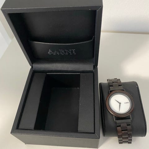 Aarni rannekello naisille, valmistettu puusta. Kellossa on puinen ranneke ja hopeanvärinen kellotaulu.