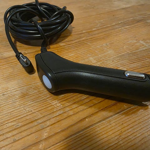 Laturi autokäyttöön, jossa Mini-USB-liitäntä. Musta väri ja pitkä johto mahdollistavat joustavan käytön ajoneuvossa.