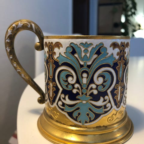 Antiikkinen teelasin pidike. Kyseessä on tribuutti Steregushchiy- laivalle, joka upposi Venäjä-Japani sodassa vuonna 1905. Emaali esittää Pietarissa sijaitsevaa laivan muistomerkkiä.