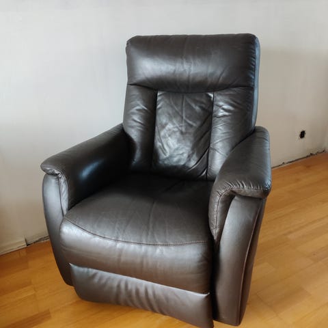 Valkoinen keinonahka nojatuoli ja rahi. Uuden veroisessa kunnossa.