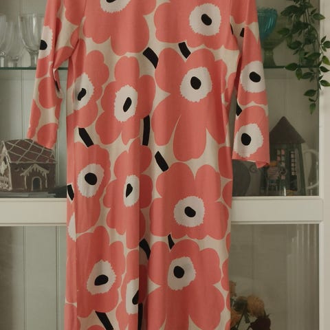 Erittäin hyvä kuntoinen Marimekon Unikko - trikoomekko. Ei ole paksu, mutta sopii esim. villatakin kanssa nyt talvellakin käytettäväksi. Muutoin ehkäpä enemmän kevät ja syksy käyttöön. Koko S, mutta ei ole pieni/tiukka, koska kangas trikoota.