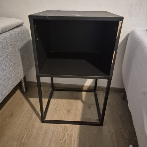 Ikean musta yöpöytä/lipasto. Laatikot liikkuu rullilla joten kevyet vetää ja työntää. Ollut kaksipuolista teippiä joten etenkin kannessa jälkiä siitä. Kannessa myös jälkiä kun hinkattu ihmesienellä ja maalia lähtenyt sen takia. Teknisesti kuitenkin toimii eli laatikot on siistit ja liikkuu kevyesti.