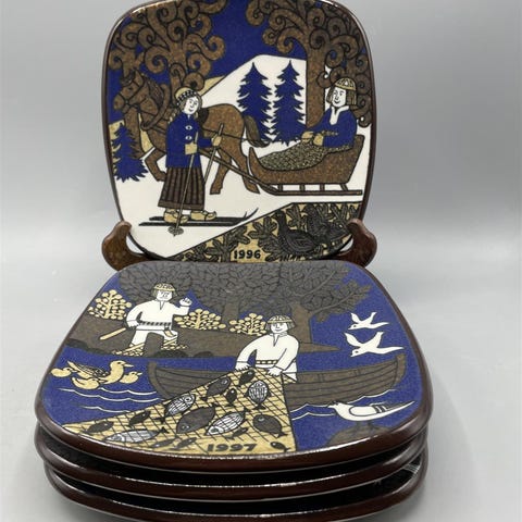 Arabia Kalevala vuosilautaset 11-osaa, vuodet 1980-1990.Design Raija Uosikkinen.