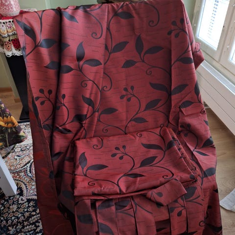 Lähes uudenveroiset. Itse lyhennetty siististi. Helppo pestä ja silittää(jos edes tarvii silitystä). Ihana joulunpunainen väri. Tuoksuton koiratalous. Myynnissä yhteensä 4 paria, eli 8 verhoa. Hinta yhdelle parille 15€.