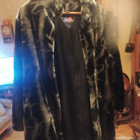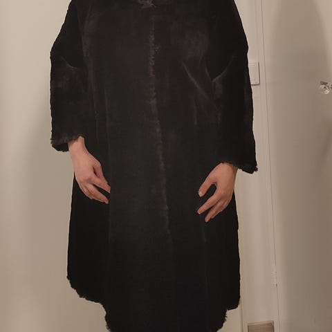 Musta pitkä turkistakki naisille koossa XL. Takki on valmistettu turkismateriaalista.