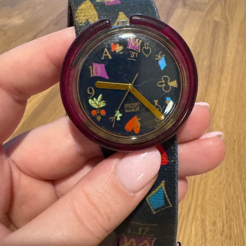 Lasten rannekello. Kellossa on pyöreä kellotaulu, jossa on valkoinen tausta ja mustat numerot. Kello on varustettu mustalla rannekkeella. Kello puhdistettu ja uusi paristo asennettu.