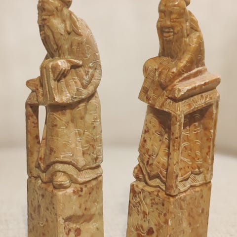 Kuvanmukainen pieni kokoelma kiinalaisia kiviveistoksia, jotka esittävät ihmishahmoja. Korkeammat parit lienevät joitain munkkeja tms, pienemmät ehkä tavallisia työläisiä? Figuurit on veistetty käsin erilaisista kivilaaduista ja lienevät melko vanhoja. Pientä iänmukaista käytönjälkeä.