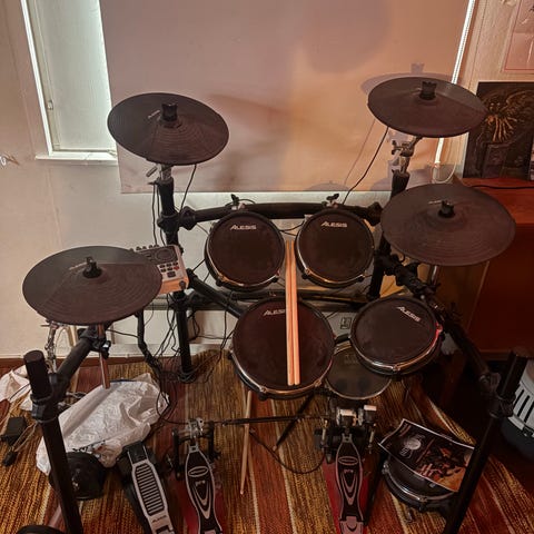 Alesis Nitro DM7X sähkörumpusetti, jossa on mukana rumpumoduuli, kuulokkeet ja pedaalit. Rumpusetti sisältää useita rumpupadit ja virvelin, jotka on suunniteltu sähköiseen rumpupelaamiseen. Sopii harjoitteluun ja kotikäyttöön. Kuulokkeet Vic Firth ovat uudet.