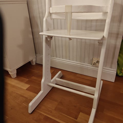 Käytetty syöttötuoli. lakattu koivu. Säädettävä jalkatuki.