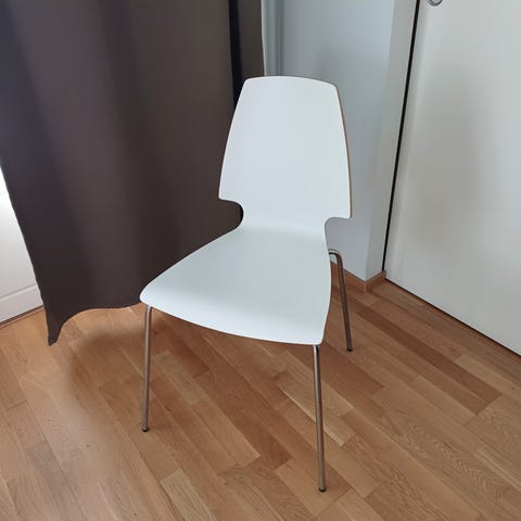 Valkoinen Tuoli jossa metalli jalat. Kunto hyvä mutta normaaleja käytön jälkiä löytyy.