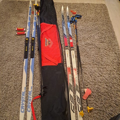 Fischer ja Salomon perinteisen- ja luistelutyylin hiihtosukset. Eri malleja, pituuksia ja jäykkyyksiä yksityisestä perhekäytöstä. Kaikki SNS Pilot mono yhteensopivia.