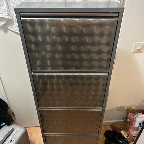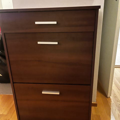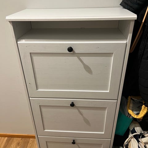 Annetaan esim kenkähylly. Ihan perus ok kondiksessa, pieniä kolhuja on mutta ei pistä silmään. Tuossa yläosassa kaksi ripustuskoukkua mihin saa verhon eteen jos haluaa