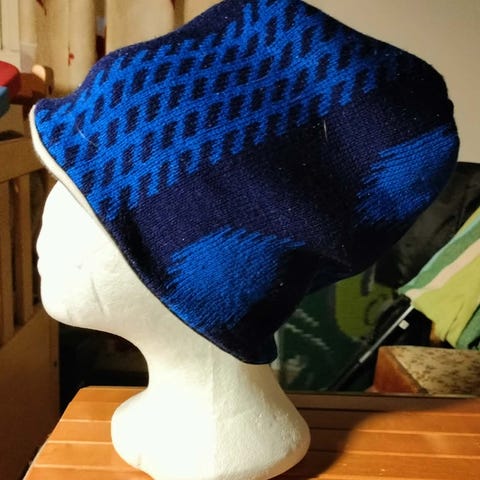 Ommeltu uusio pipo. Päällinen puuvillaneulosta, vuori trikooneulosta. Koko; ymp. 48cm, korkeus 22cm, sopii aikuselle. Hp. 5€ +pk
