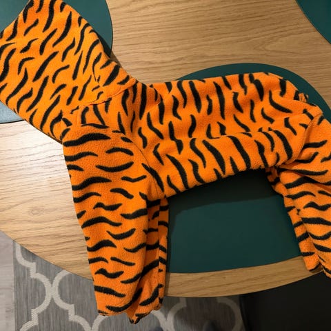 Koiralle lämmin haalari, kaksinkertainen paksu ja lämmin fleece, tässä myös hännänlämmittimelle paikka johon kiinnitys tarranauhalla ja napilla. Selänpituus noin 35cm