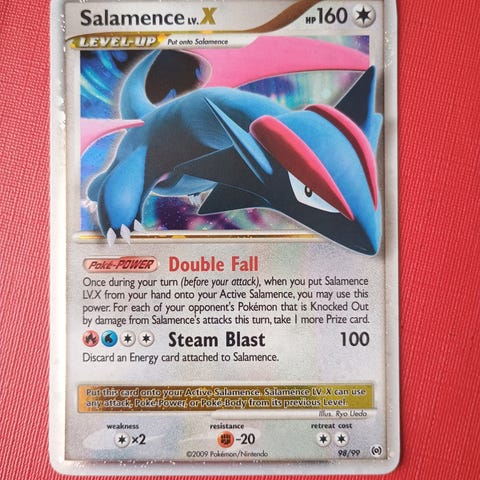 Dragon Frontiers setistä Salamence ex Holo. Kunto kohtalainen, joten kulumaa näkyy.