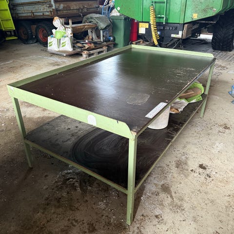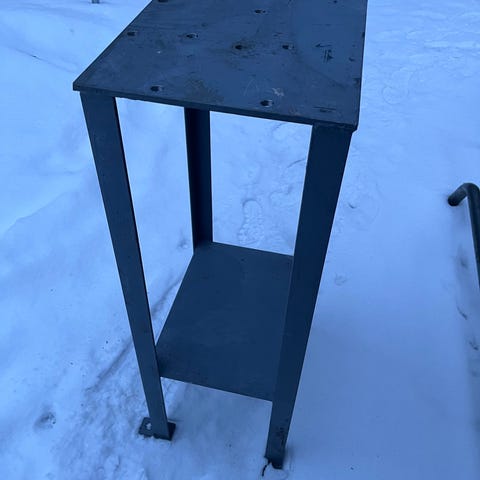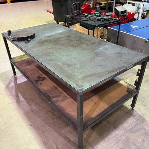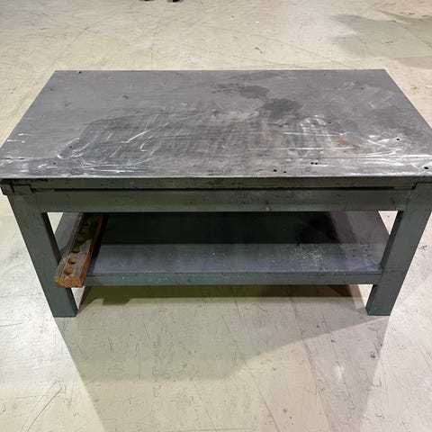 Metallinen työpöytä, jossa on keskellä pyöreä reikä. Tukeva pöytä.