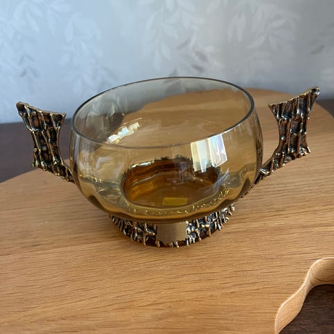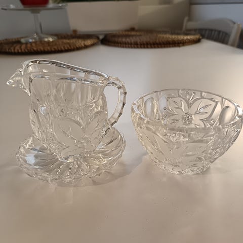Saara Hopean lasinen sokerikko ja kermakko. Siistissä kunnossa. Pohjassa pikkuisen kulumaa. Saa myös noutaa Jyväskylän keskustasta.