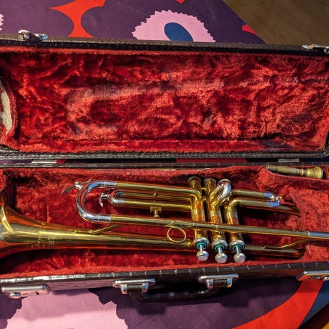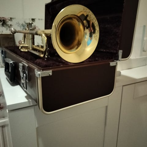 Hakusanat: jazz, historia, hüttl-cup, keräily, suukappale, vintage, messinki, patina, musiikki, trumpetti, soittimet, englanti, kotelo, Paketoitava, puhallinsoitin, vintage huonekalut, nuotit, orkesteri