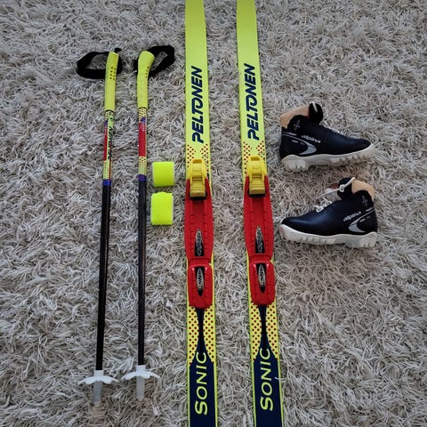 Lasten suksisetti sns siteillä. Sukset 100cm, sauvojen pituus 70cm sompaan asti. Sisältää kahdet sns monot. Siniset kokoa 27 ja nauhalliset 28.