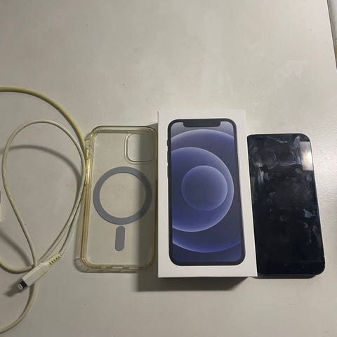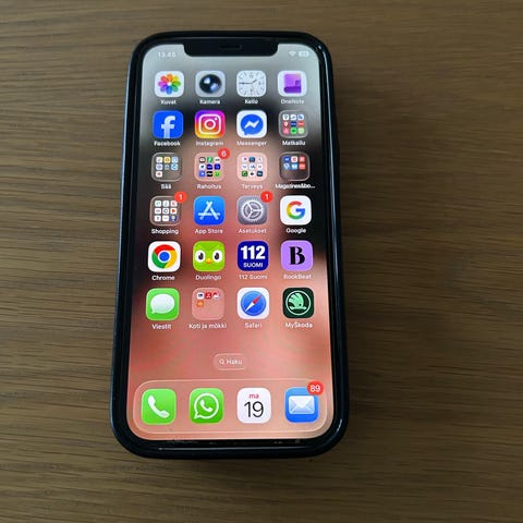 Apple iPhone 12 -puhelin, 64 gigatavua tallennustilaa. Takalasi on yläkulmasta vähän rikki ja alareunassa pieni kolhu, lisäksi hieman pieniä naarmuja. Puhelin toimii loistavasti. Akun kunto 79%. Nouto Sellosta