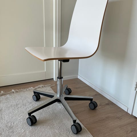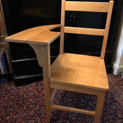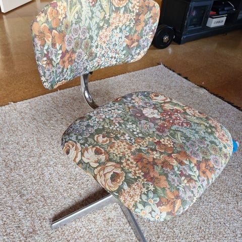 Vanha iskun puinen työtuoli, joka on verhoiltu (ompelija teki) muutama vuosi sitten.